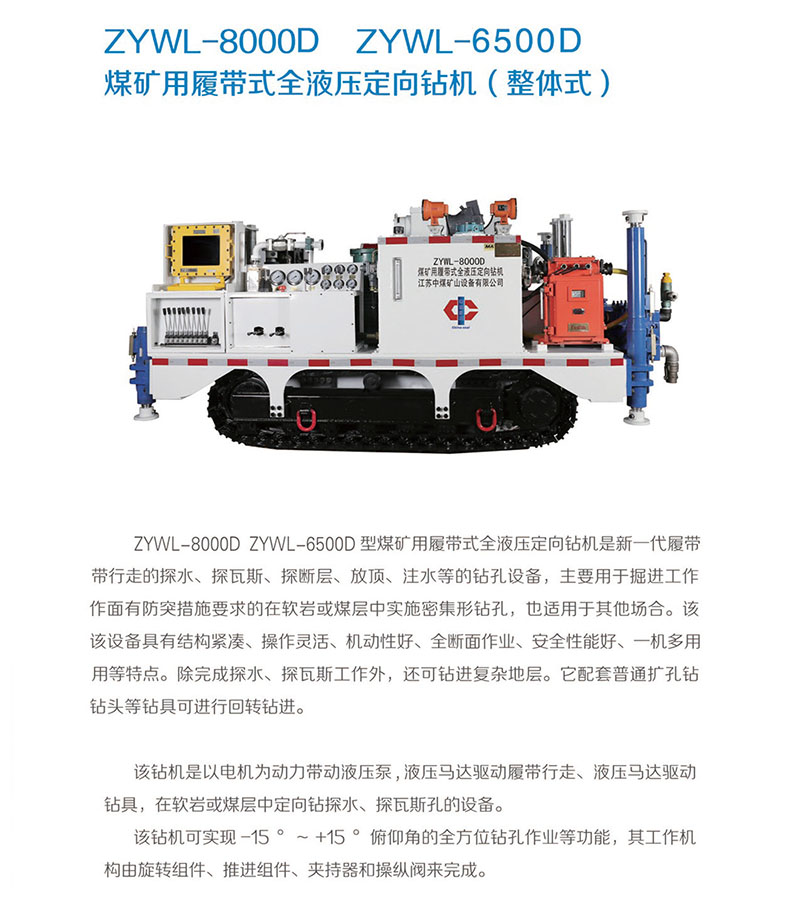 配套ZXC2000隨鉆測量裝置由KJD127礦用隔爆兼本安型計算機(jī)、ZXC2000-T隨鉆測量探管、ZXC2000-C礦用本安型測量數(shù)據(jù)處理器及FHJ5礦用本安型鍵盤組成。可選配FHS16/5 礦用本安型數(shù)據(jù)存儲器用于數(shù)據(jù)轉(zhuǎn)移。 ZYL-8000D型煤礦用履帶式全液壓定向鉆機(jī)是新一代履帶行走的探水、探瓦斯、探斷層、放頂、注水等的鉆孔設(shè)備,主要用于掘進(jìn)工作面有防突措施要求的在軟巖或煤層中實施密集形鉆孔,也適用于其他場合。該設(shè)備具有結(jié)構(gòu)緊湊、操作靈活、機(jī)動性好、全斷面作業(yè)、安全性能好、一機(jī)多用等特點。除完成探水、探瓦斯工作外,還可鉆進(jìn)復(fù)雜地層。它配套普通擴(kuò)孔鉆頭等鉆具可進(jìn)行回轉(zhuǎn)鉆進(jìn)。