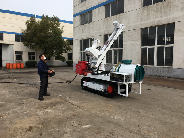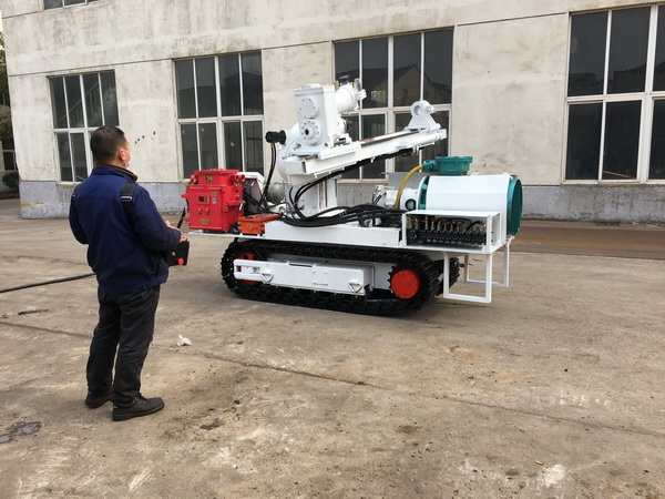 該鉆車由主機液壓系統、履帶行走部、工作機構、機架、遙控器、無線智能接收裝置等部分組成,采用智能遙控系統,以人車分離無線遙控的方式,實現鉆桿自動升降、自動鉆進、多角度全方位打鉆等功能,遠程化、可視化操作,解決人車分離的難點。該設備除完成探水、探瓦斯工作外,還可鉆進復雜地層。它配套普通擴孔鉆頭等鉆具可進行回轉鉆進。